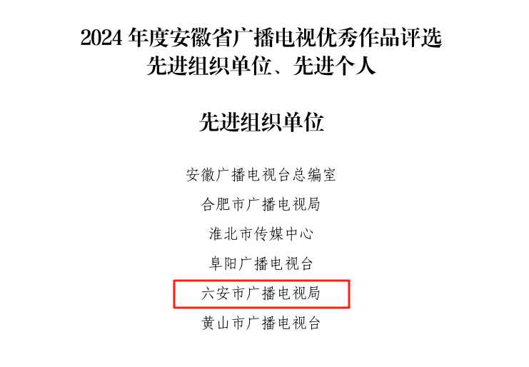 近日,安徽省广播电视局、安徽省广播电视联合会公布了2024年度安徽广播电视优秀作品评选结果,我市多部作品入选,市广播电视局也获评2024年度安徽省广播电视优秀作品评选先进组织单位。