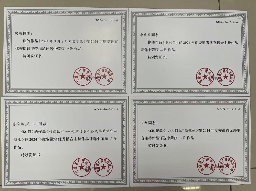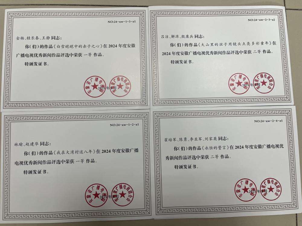 其中,《白雪皑皑中的赤子之心》《我在大湾村这八年》等14件作品荣获2024年度安徽广播电视优秀新闻作品;《原来古人这么“潮”之“千年小青兽”》《字,有道理》等4件作品荣获2024年度安徽省广播电视优秀文艺作品;《2024年3月8日声动蓼城》《乡村行》等5件作品荣获2024年度安徽省优秀播音主持作品。