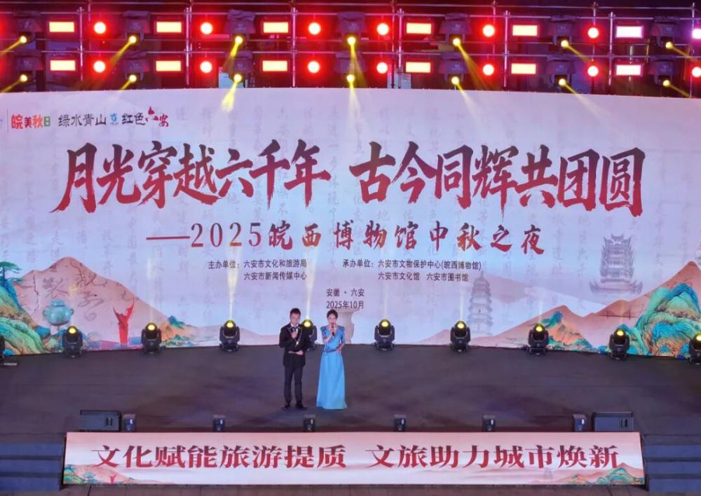 一轮明月照古今,千年文脉共此情。中秋之夜,皖西博物馆内华灯璀璨,“月光穿越六千年 古今同辉共团圆”主题晚会隆重启幕。一场以月光为媒介,贯通古今的文化盛宴,通过情景剧、歌舞、非遗展示、文旅文创推介等多元形式,生动展现了六安深厚的历史底蕴与文旅融合的创新活力,为全市人民献上了一场精彩纷呈的“双节”文化大餐。