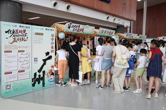 市图书馆二楼共享大厅变身“大唐荔枝驿道”,读者通过“打卡地图任务+荔枝兑换”体验一场融合书香、新颖创意的“文化互动市集”。十余个非遗体验区及图书展销台前人潮涌动,“图中藏诗、投壶捶丸、手绘书签、射礼贺荔”等传统文化项目深受亲子家庭欢迎,让孩子们在趣味互动中学诗词、集印章、品文化。精心准备的900余份精美文创成为读者们“运送荔枝”打卡成功的美好纪念品。“没想到古代民俗游戏这么有趣!”读者卢文君笑着分享道,“今天特意带孩子来观看表演、参与诗词互动游戏,寓教于乐的形式让我们收获满满,既增长了知识,又体验到了传统文化的魅力。”