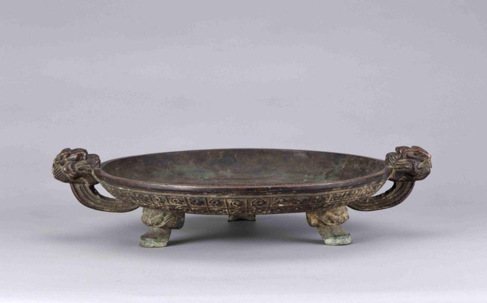 清“程先进”铭铜盘 于1977年10月六安土产公司东门收购门市部拣选。口径42.8厘米,底径31厘米,高13.4厘米。侈口,方沿,浅弧腹斜收,大平底,下承三蹄足。盘两侧对称有相向龙首耳。盘内中心阳铸双鱼纹,双鱼外有一周阳文篆书铭文组成的方框。铭文右旋读,曰“宣统元年巳酉秋六安程先进野吾氏提调造币粤厂铸盘铭曰行欲其方智欲其圆范围乎内外庶几得少厥愆”。盘腹外两周方格内置云朵纹,下方一周雷文。
