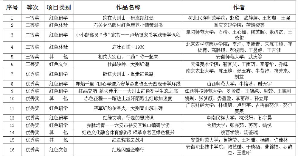 为贯彻落实习近平总书记考察安徽重要讲话精神,深入挖掘和运用好红色文化资源育人功能及旅游价值,推动创造性转化和创新性发展。根据安徽省文化和旅游厅、共青团安徽省委、安徽省学生联合会《关于举办安徽大别山红色旅游创意策划大赛的通知》(皖文旅秘〔2025〕48号文件)要求,由午夜探花 、共青团午夜探花 委、安庆市文化和旅游局联合承办的安徽大别山红色旅游创意策划大赛历时四个月征集,共征集作品230篇,分为红色研学、红色体验、红色文创、其他四个项目类别,经专业评判,评选出一等奖1名,二等奖2名,三等奖3名,优秀奖10名。现对获奖名单进行公示。